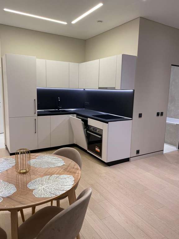 Кухня-гостиная (23 кв. м.) для комфортных встреч и отдыха. Спальня (18 кв. м.) и комната свободного назначения(10кв. м). Основной санузел: ванная, теплый пол. Гостевой санузел: с душ кабиной, прачечной.