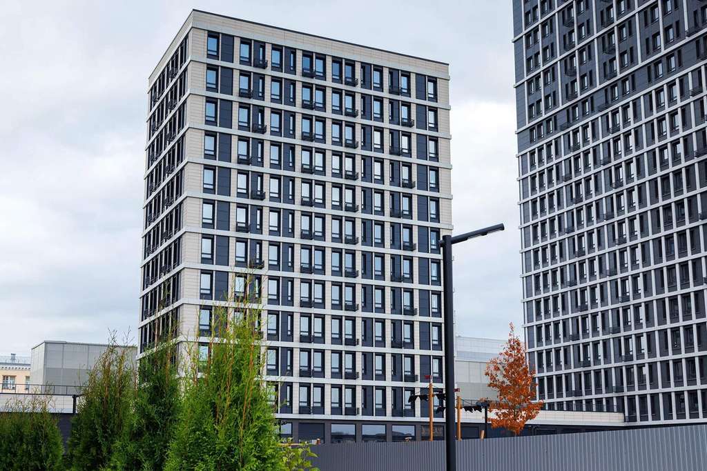 Современная архитектура от T+T Architects с металлическими фасадами, панорамным остеклением и закрытыми дворами (детские площадки playhub, спортзоны) . Комплекс сочетает урбанистику и комфорт - идеально для бизнеса с потоком жителей и посетителей.