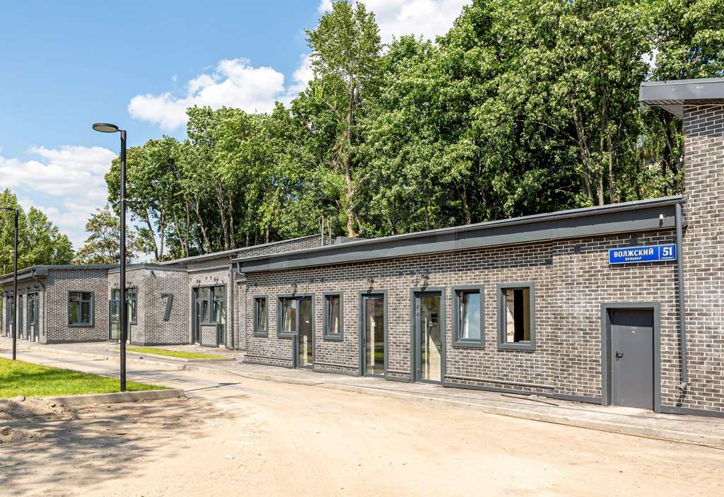 Отделка фасадов выполнена панелями с имитацией клинкерного кирпича. Дополнительно на территории организованы зоны отдыха на свежем воздухе, также дополнительно имеется возможность для организации летних веранд и кафе.