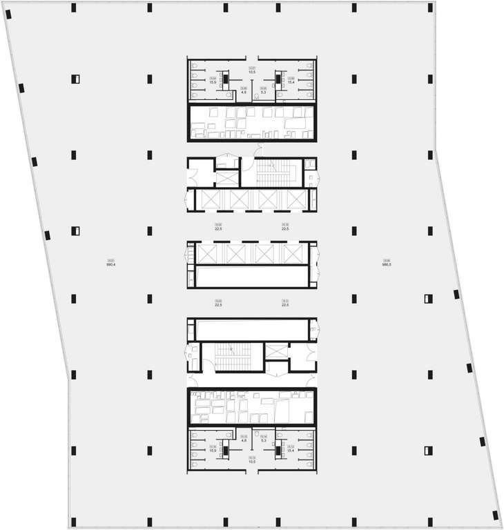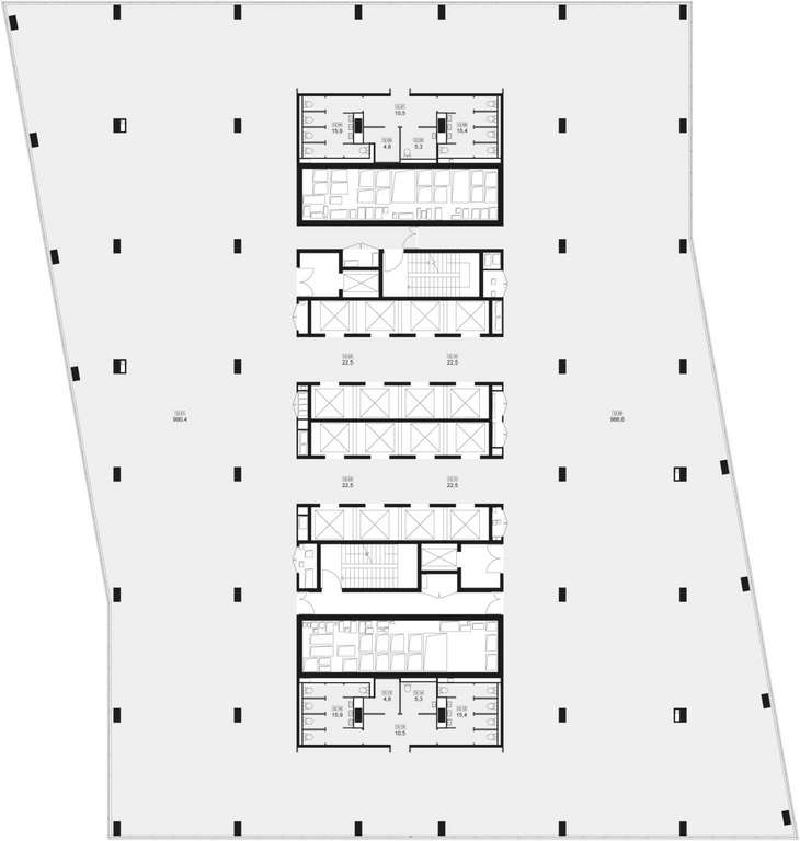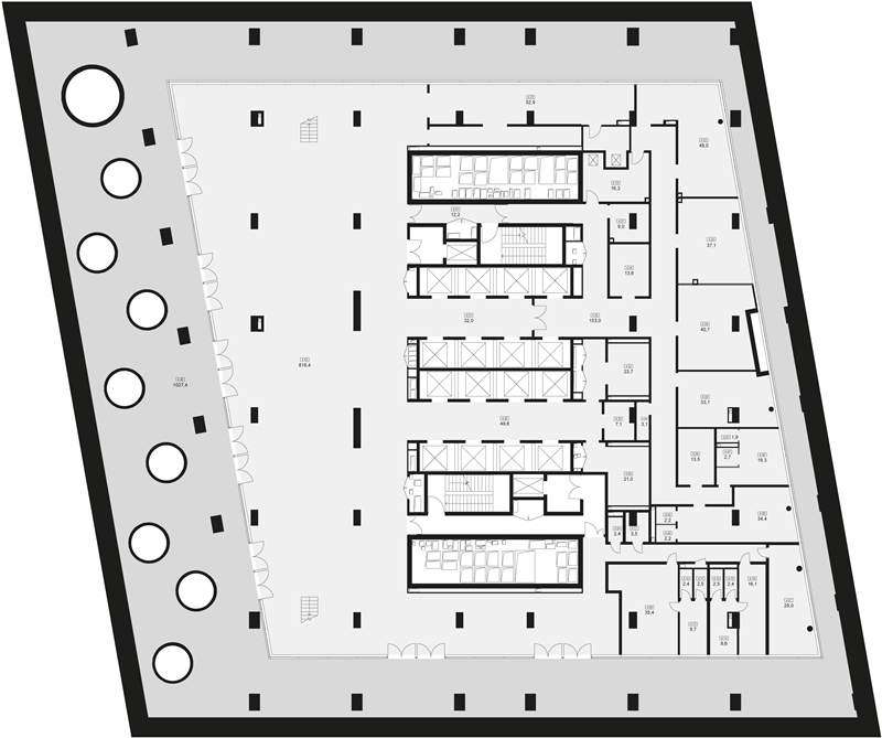 5 отдельных лифтовых групп, в т. ч. 17 грузопассажирских лифтов