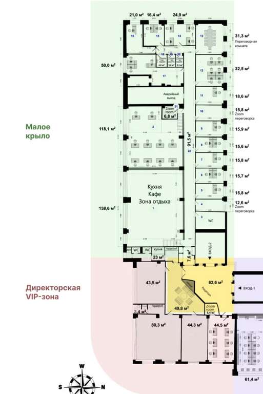 - VIP-зона, в которую входят большой кабинет, просторный лобби, переговорная комната с кухней. Зона оборудована новейшей техникой и дизайнерской мебелью премиум-класса.