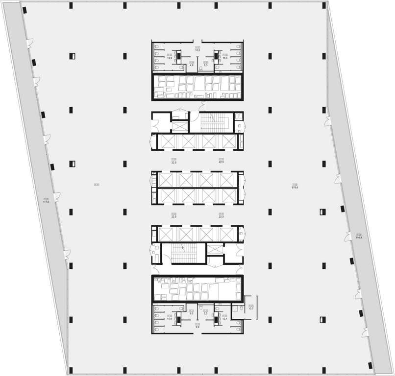 5 отдельных лифтовых групп, в т. ч. 17 грузопассажирских лифтов
