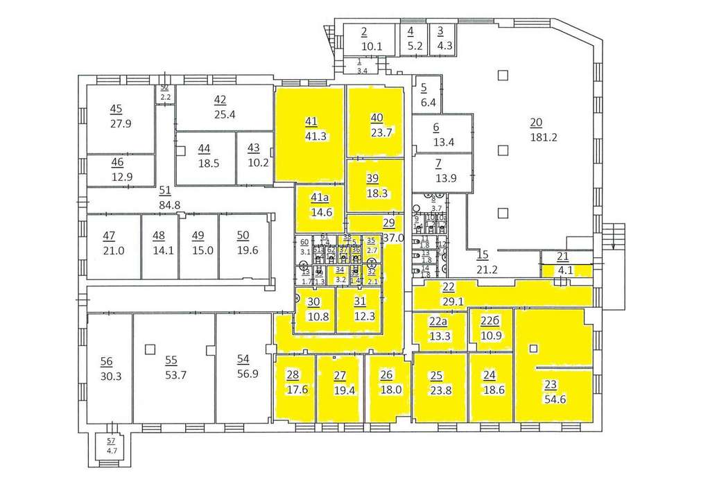 Офисный блок с отдельным входом. Помещение разбито на несколько кабинетов (54,6 кв. м., 41,3 кв. м., 23,8 кв. м., 19,4 кв. м., 17,6 кв. м., 18,3 кв. м., 14,6 кв. м., 13,4 кв. м., 10,9 кв. м., складские помещения (23,7 + 12,3 кв. м. ) , серверная, кухня 10,8 кв. м., а так же 3 с/у.