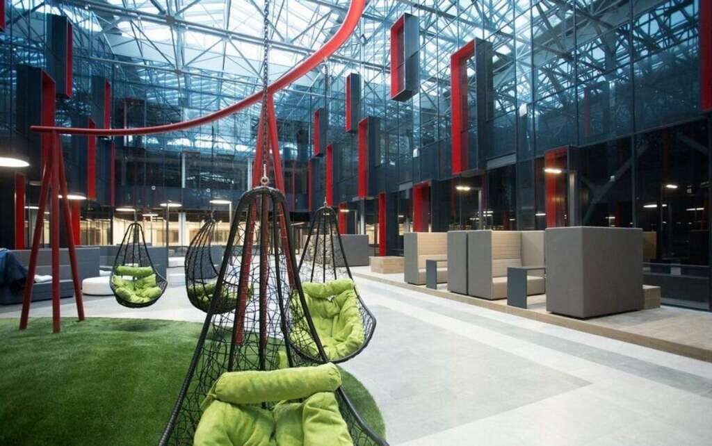 Уникальная фишка: 8 дизайнерских атриумов с 8-метровыми потолками, зонами для работы и общения. В одном из атриумов — профессиональный теннисный корт!