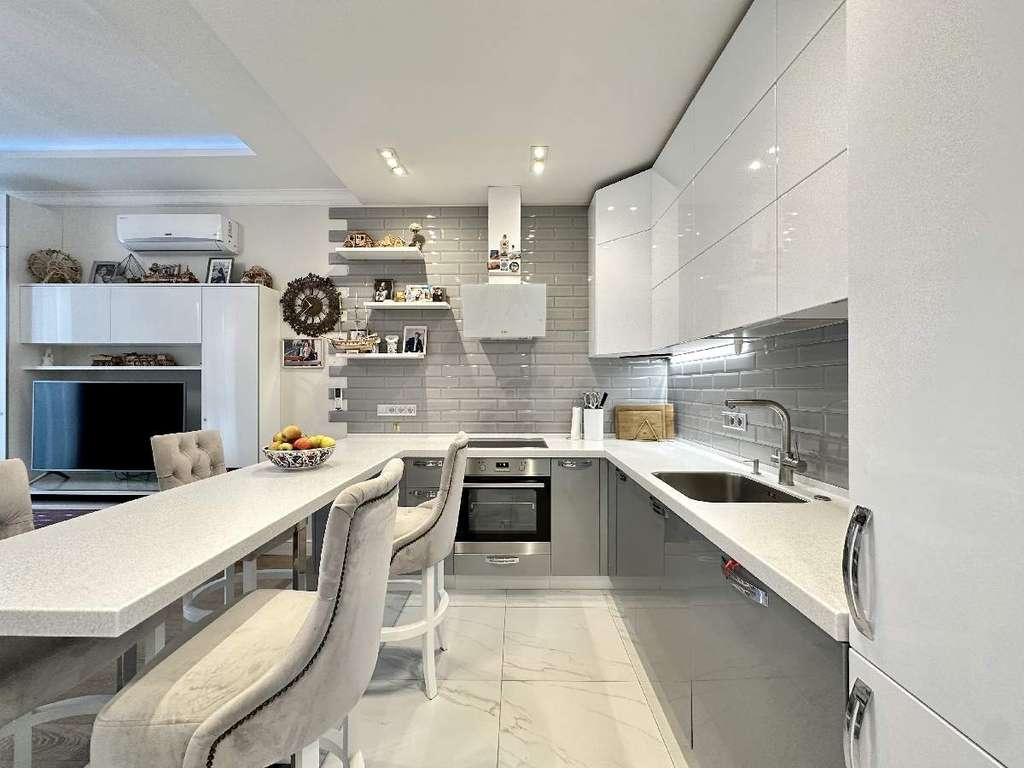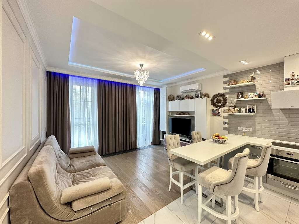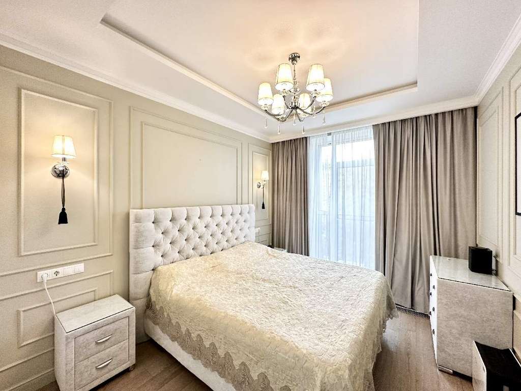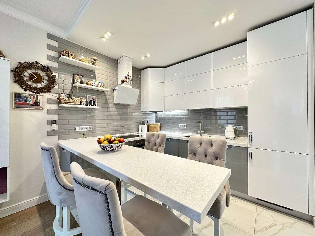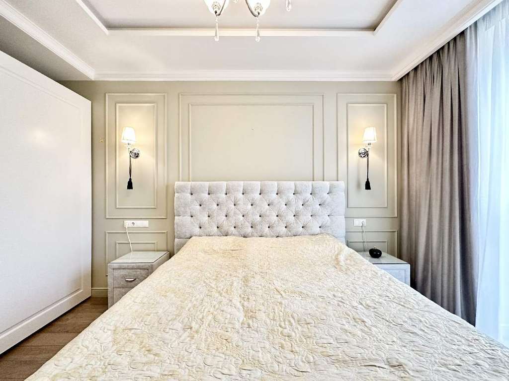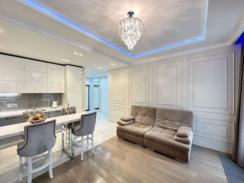 Окна в квартире выходят на тихий и очень зеленый бульвар с прогулочными дорожками и уютной аллеей. Высокие потолки 3 м., окна в пол и светлые тона интерьера создают в квартире ощущение простора и воздушности. Дизайнерский ремонт выполнен с использованием качественных европейских материалов, фурнитуры и сантехники известных производителей. Организация пространства продумана до мелочей: изолированная спальня, просторная кухня-гостиная, оснащенная всей необходимой техникой популярных качественных брендов, с обеденной зоной и мягкой мебелью.