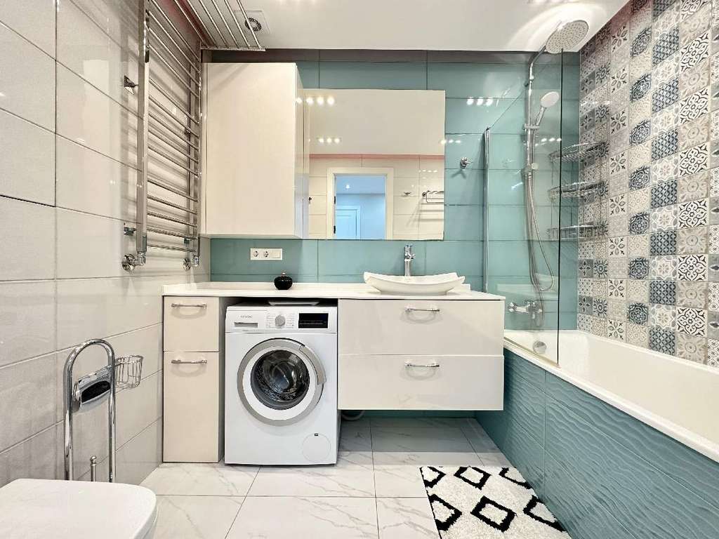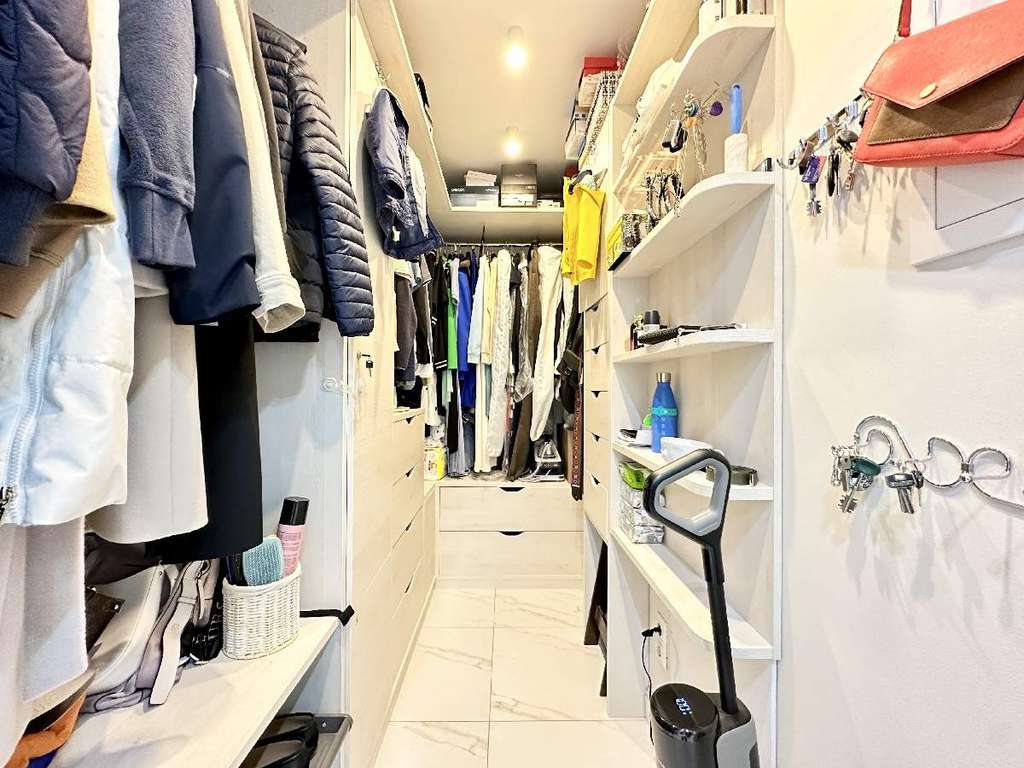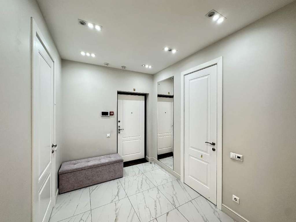 Просторная прихожая с оборудованной большой гардеробной комнатной, оснащенной всем необходимым оборудованием для организации большого количества мест хранения. Просторный С/У выполнен в пастельных тонах, оснащен всей техникой и подогреваемым полом.