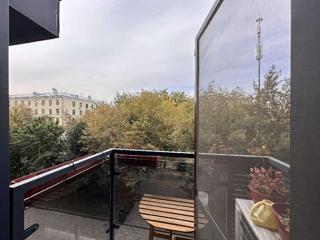 Небольшой, но очень уютный балкон со столиком, располагающий к вечернему чаепитию с видом на красиво освещенный сквер. Интеллигентные соседи.