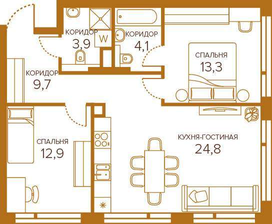 Общая площадь квартиры - 68.7 кв. м. В квартире выполнена премиальная отделка в неоклассическом стиле.