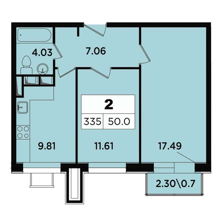Просторные 2-комнатные апартаменты 50 м2 с балконом без отделки — любой дизайн на свой вкус. Состав: 2 комнаты, 11,6 и 17,5 кв. м, просторная кухня 9,8 м2, совмещённый с/у, просторный холл 7 м2, балкон 2,3 м2. 9 этаж — много света и отличные виды.