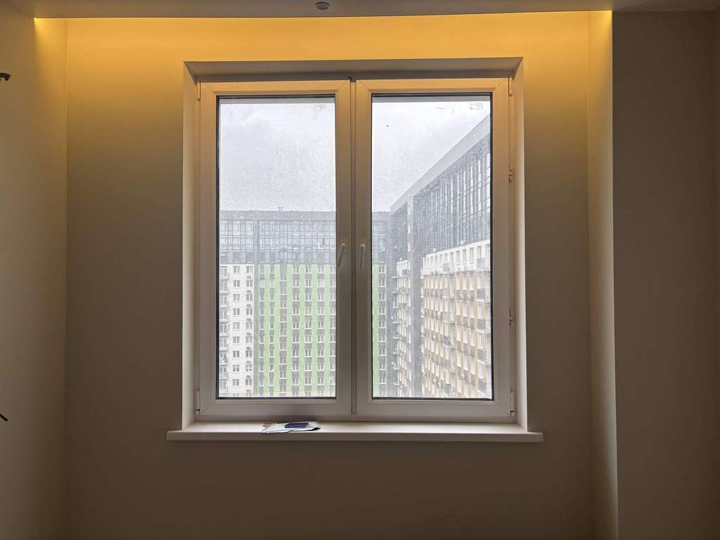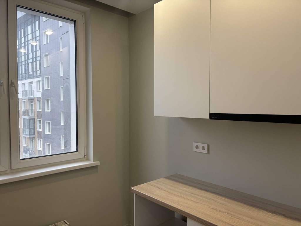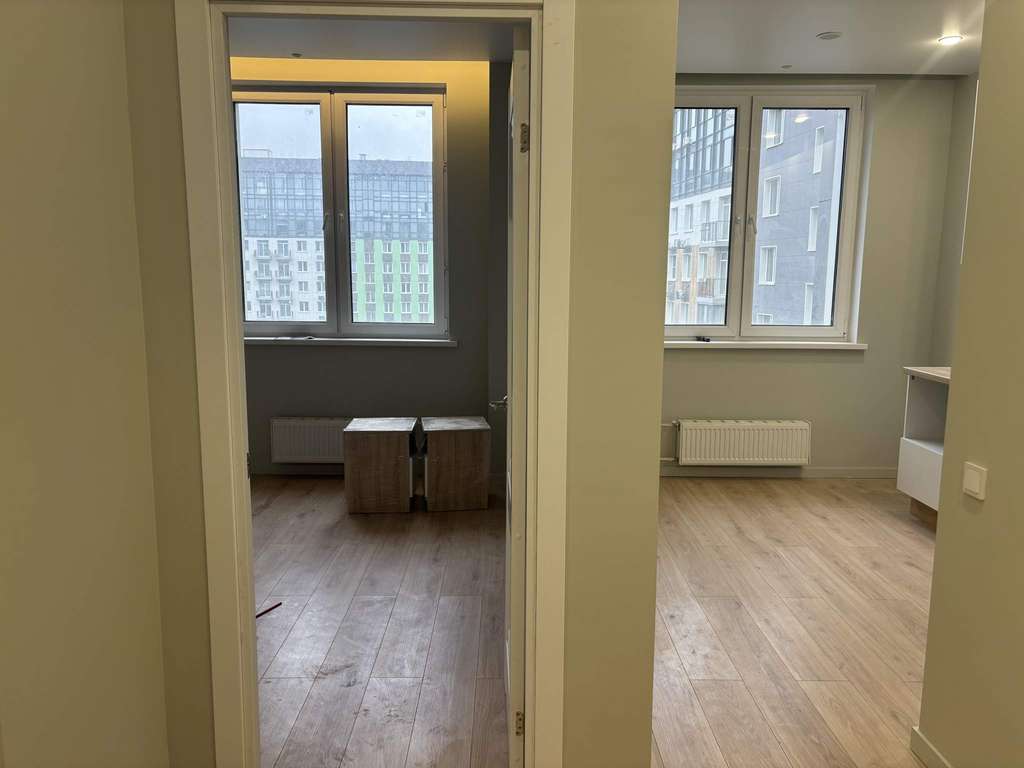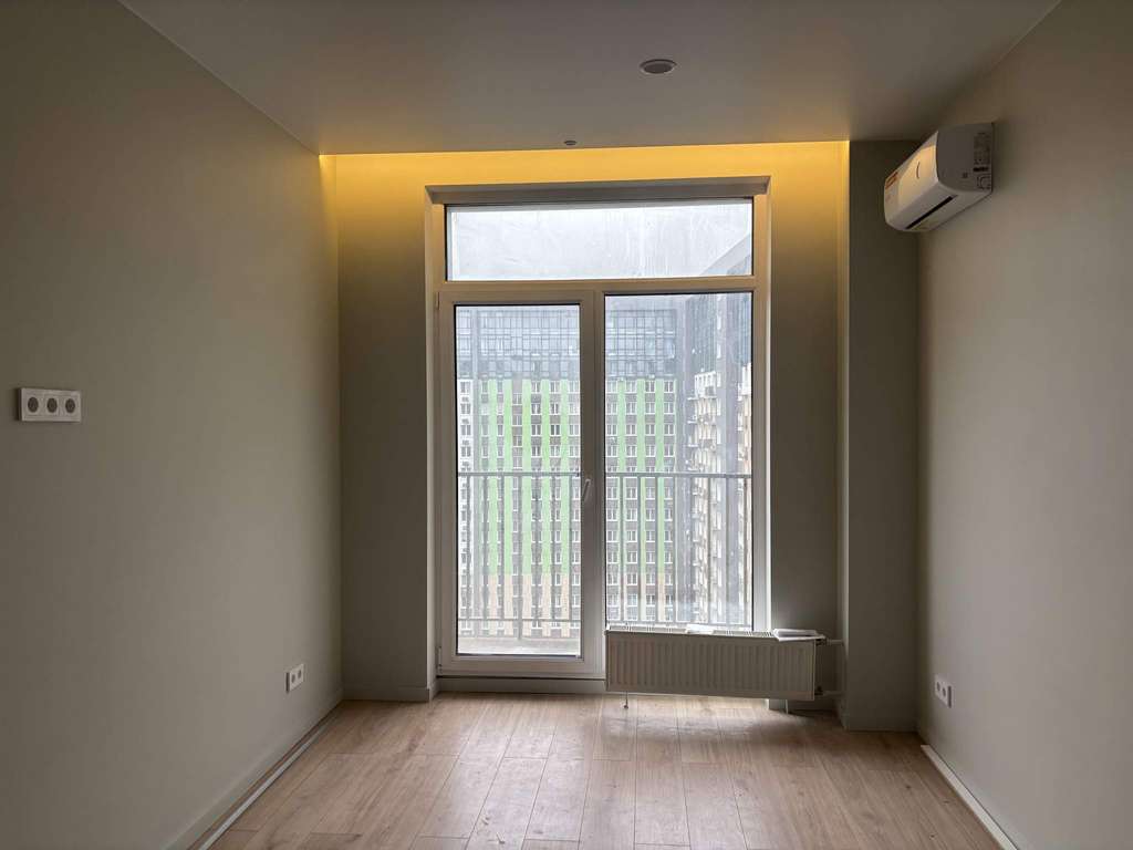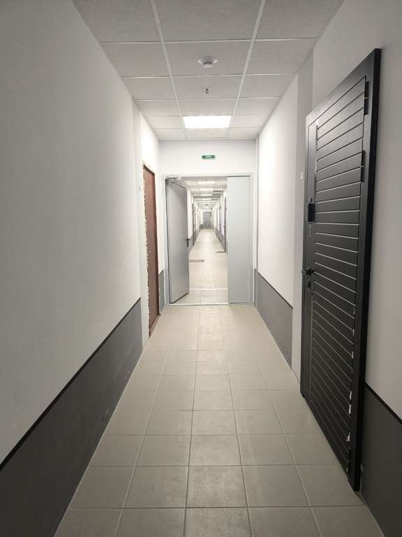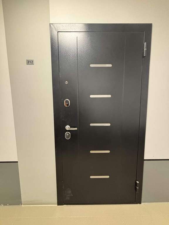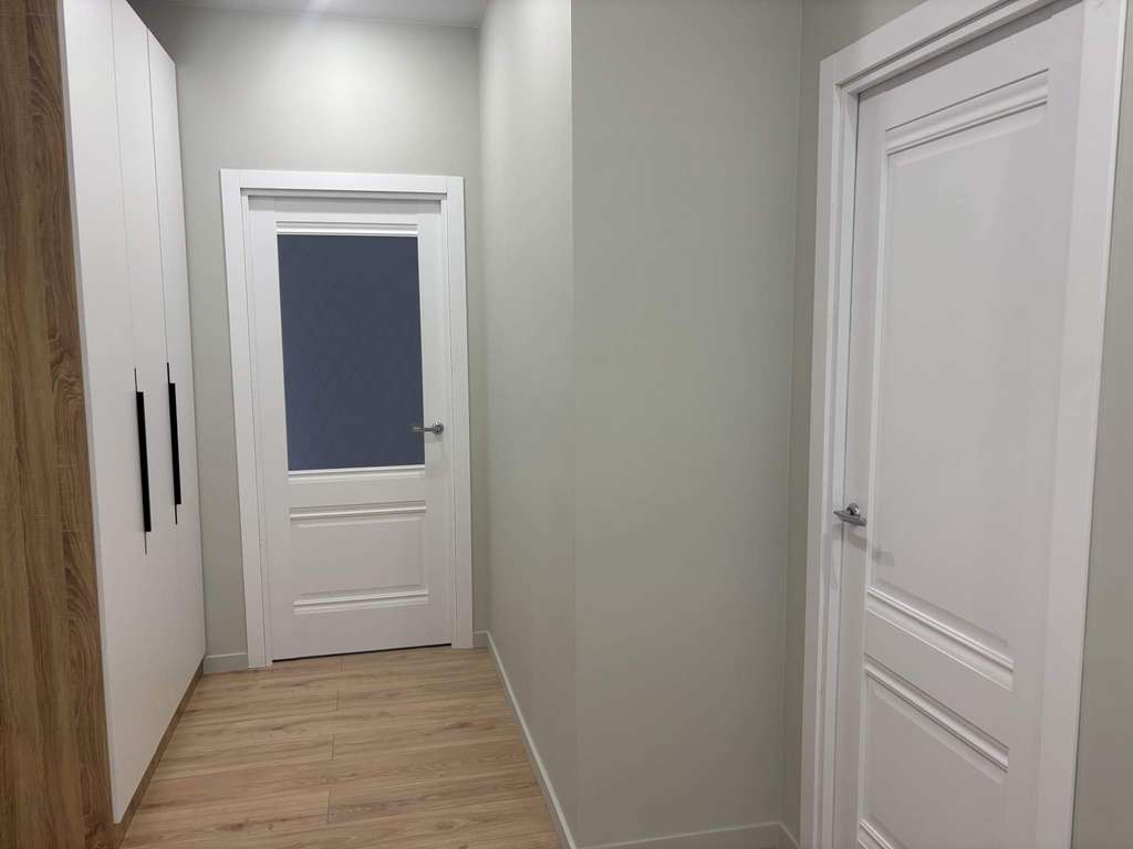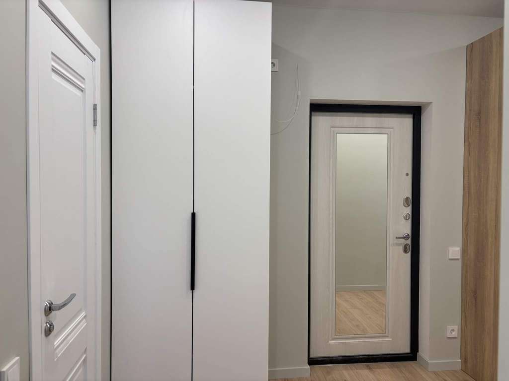 Входная дверь с зеркалом, ламинат 32 класса, натяжные потолки, обои в сдержанных тонах, межкомнатные двери, розетки, выключатели, точечные светильники, установлен кондиционер;