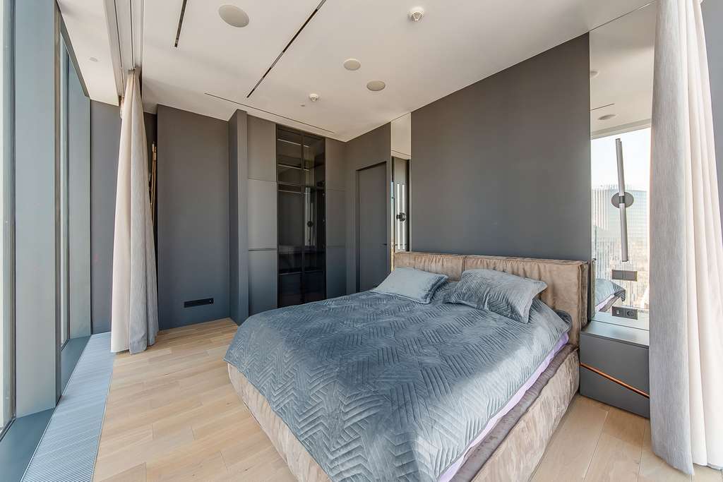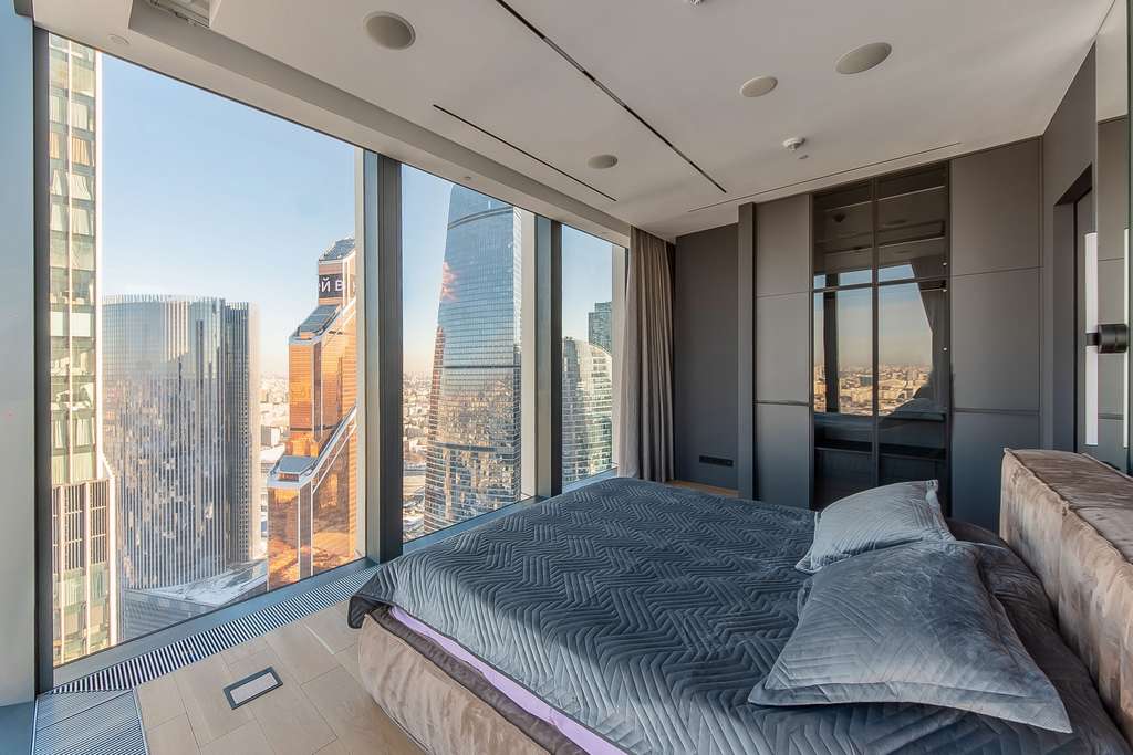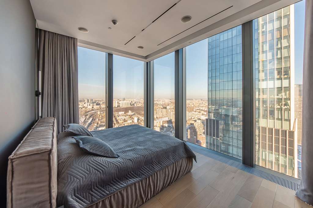 Панорамные окна на 2 стороны. Из всех окон открываются ошеломляюще виды на город и башни Москва-сити, а также на Москва реку. Особенно впечатляет видовая мастер-спальня: здесь две стеклянные стены открывают виды на обе стороны света, на город и Сити. Вторую спальню можно использовать как кабинет. В такой атмосфере приятно и продуктивно работается. На фотографиях: актуальные виды из данной квартиры.