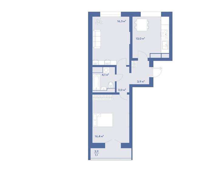 Две изолированные комнаты, одна с лоджией. Просторная кухня-гостиная.