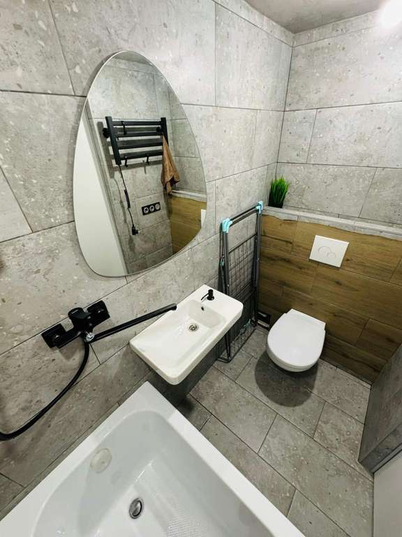 В совмещенном санузле установлена качественная сантехника — душевая кабина, унитаз, раковина, смесители.