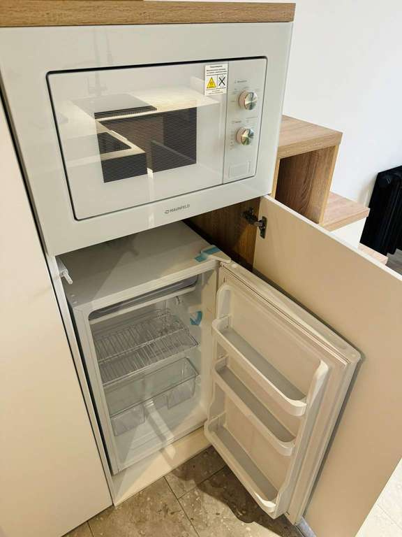 В студии выполнен стильный ремонт — стены выкрашены в светлые тона, на полу постелен ламинат, есть вся необходимая мебель и бытовая техника, в холле встроена система хранения.