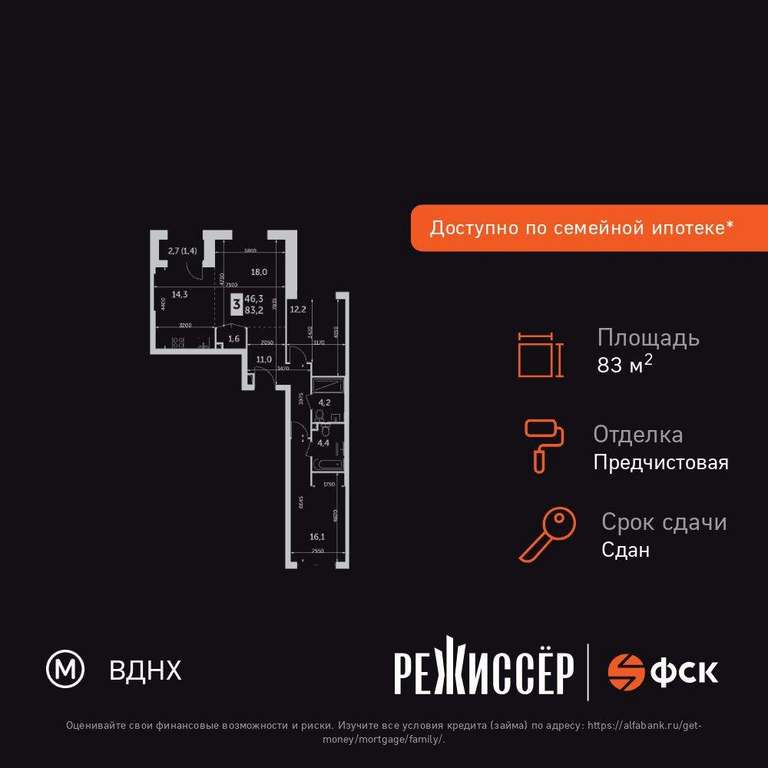 Жилая площадь 46.3 м2, кухня 14.3 кв. м, ремонта нет, окна выходят во двор.
