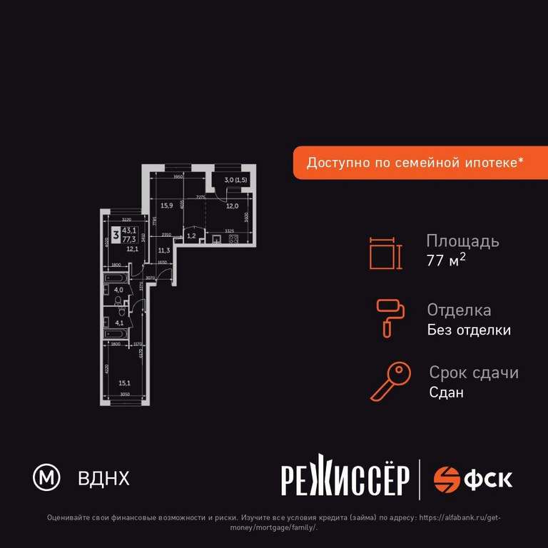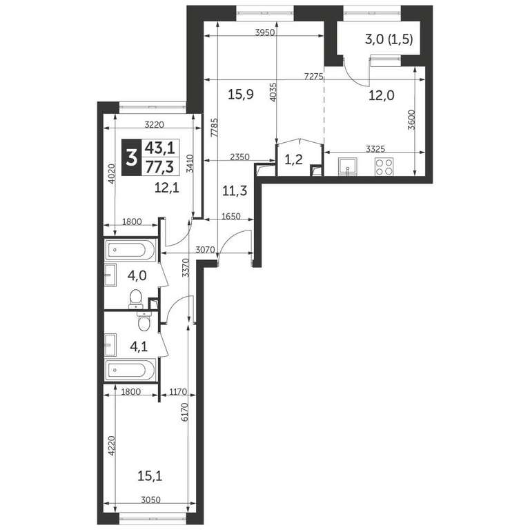 Продается 3-комн. квартира, площадью 77.3 м2.