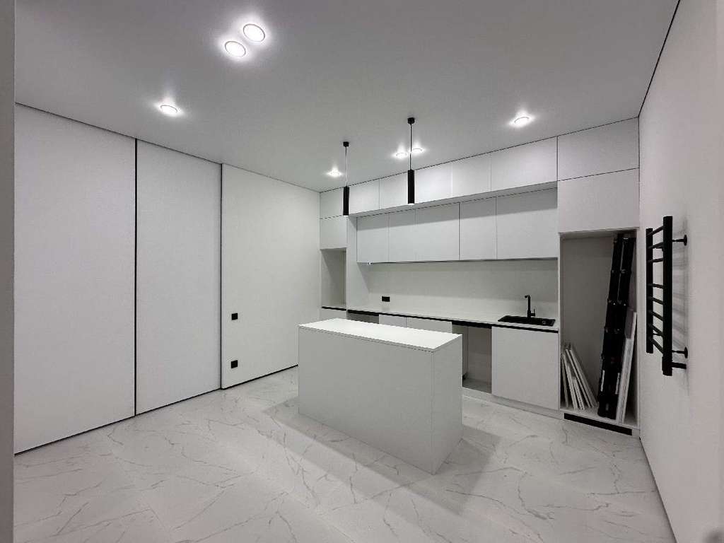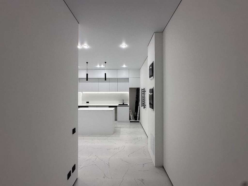 Реализовано многоуровневое освещение всей квартиры, включая кухню и обеденную зону.
