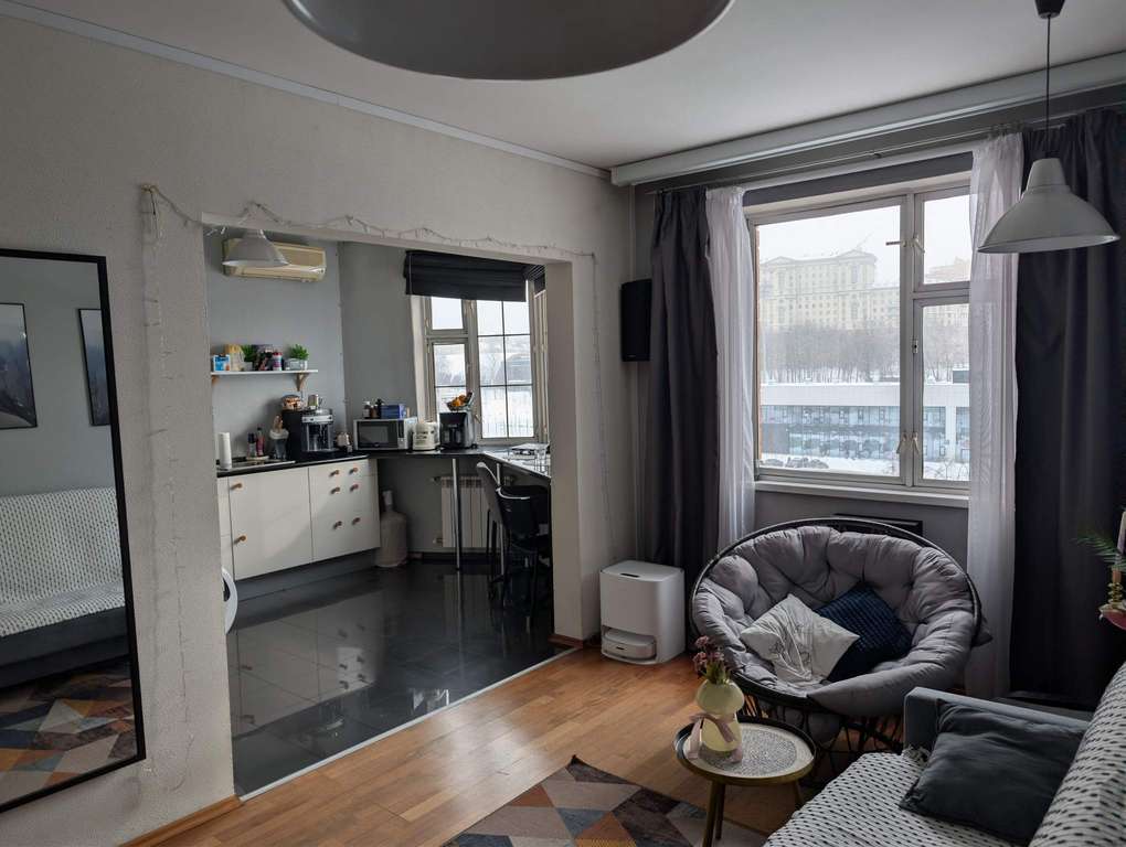 Главная особенность — современная планировка с объединенной кухней-гостиной и панорамным видом на Рубцовскую набережную. Прямо у окна организовано эргономичное рабочее место, позволяющее работать с видом на гладь реки. Перепланировка узаконена не была. Возможно, кому-то предпочтительно будет вернуть стандартную планировку с изолированными комнатами. Дом серии П-44Т 2002 года постройки расположен в престижном ЦАО. Это качественное жилье с консьержем и чистыми подъездами расположенное недалеко от метро «Электрозаводская» и «Бауманская».