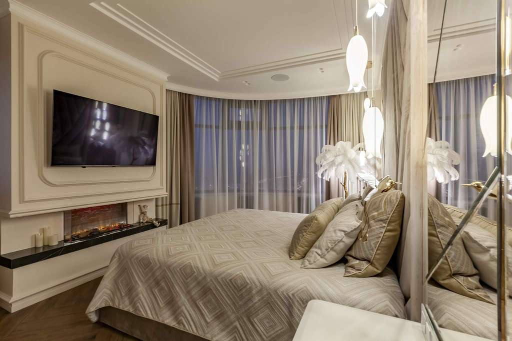МАСТЕР-СПАЛЬНЯ: кровать 2х2, высокий матрас King Koil, камин электрический DIMPLEX ignite Bold 50 с обогревом, гардеробная.