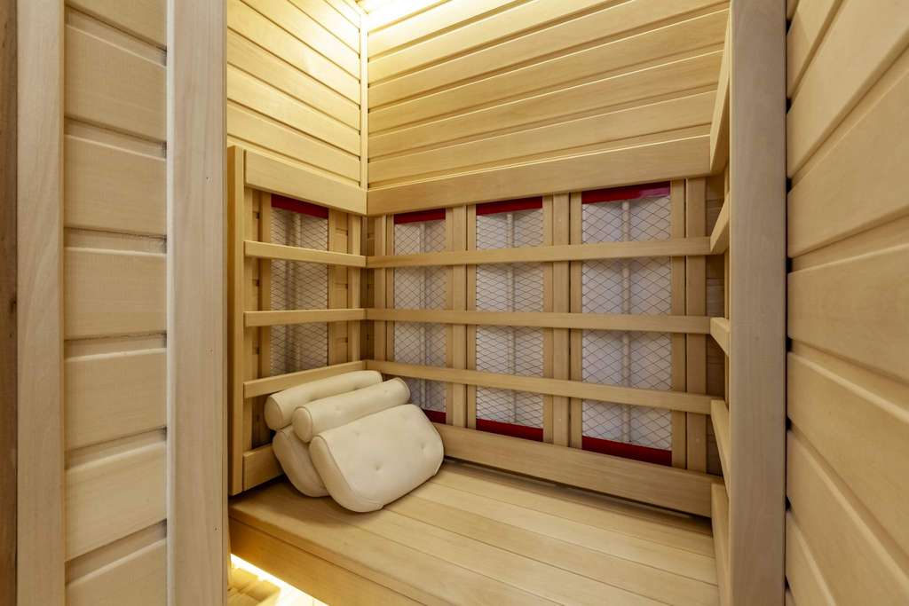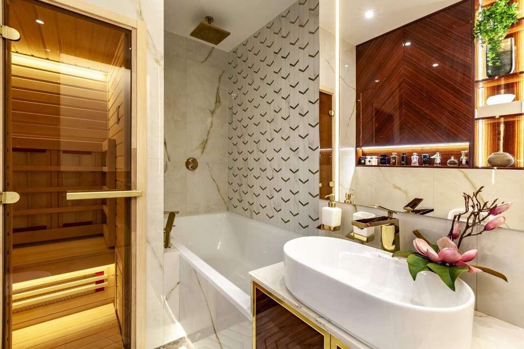 ВАННАЯ КОМНАТА: инфракрасная сауна (2х местная) , ванная большая Bette (Германия) , смарт-стекло с подсветкой, стена с обогревом