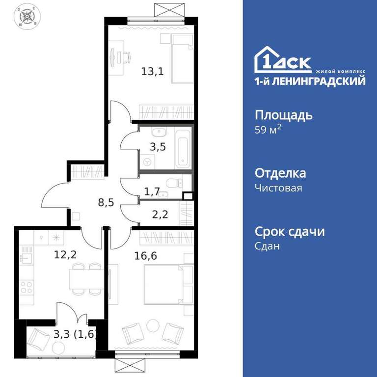 Квартира располагается на 11 этаже 13-этажного панельного дома в ЖК 1-й Ленинградский.