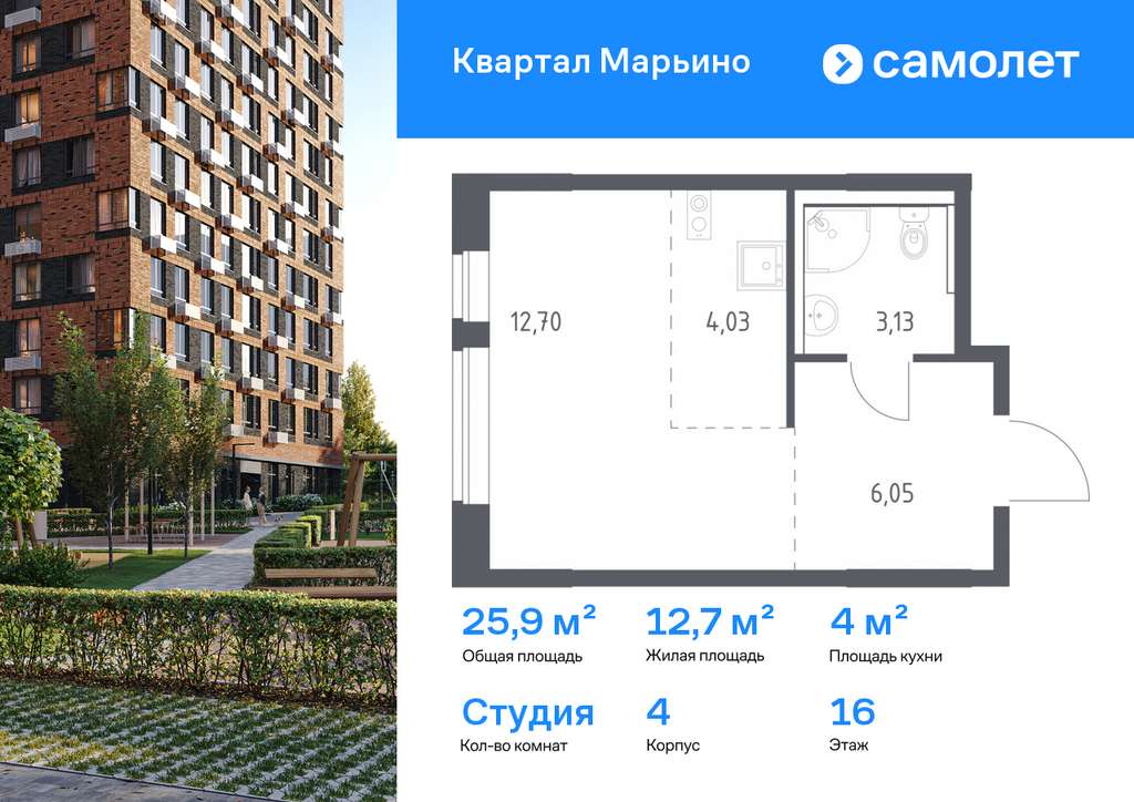 Строим кварталы для жизни с заботой о будущем. Предлагается квартира студия комфорт-класса 25,91 кв. м в корпусе 4 на 16 этаже, в ЖК «Квартал Марьино»