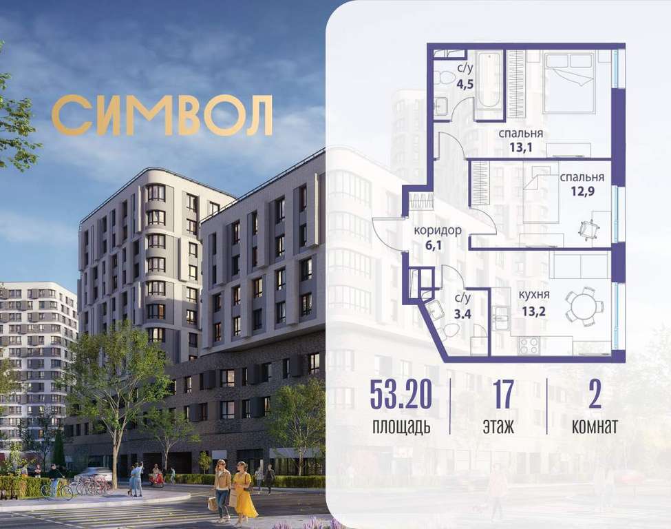 Продается 2-комнатная квартира от застройщика: общая площадь 53.20 м, жилая 26.00 м, кухня 13.20 м, 17-й этаж, жилой квартал «Вдохновение», корпус 29 (секция 4) . Срок сдачи: 1 квартал 2026 года.