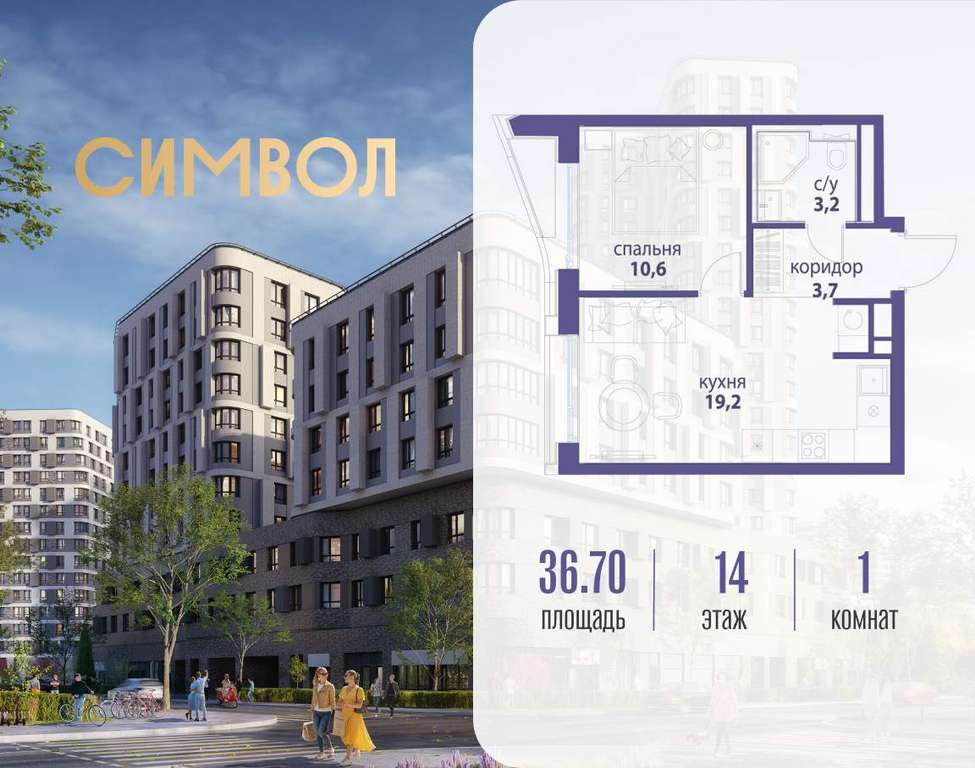 Продается 1-комнатная квартира от застройщика: общая площадь 36.70 м, жилая 10.60 м, кухня 19.20 м, 14-й этаж, жилой квартал «Вдохновение», корпус 33 (секция 3) . Срок сдачи: 4 квартал 2027 года.