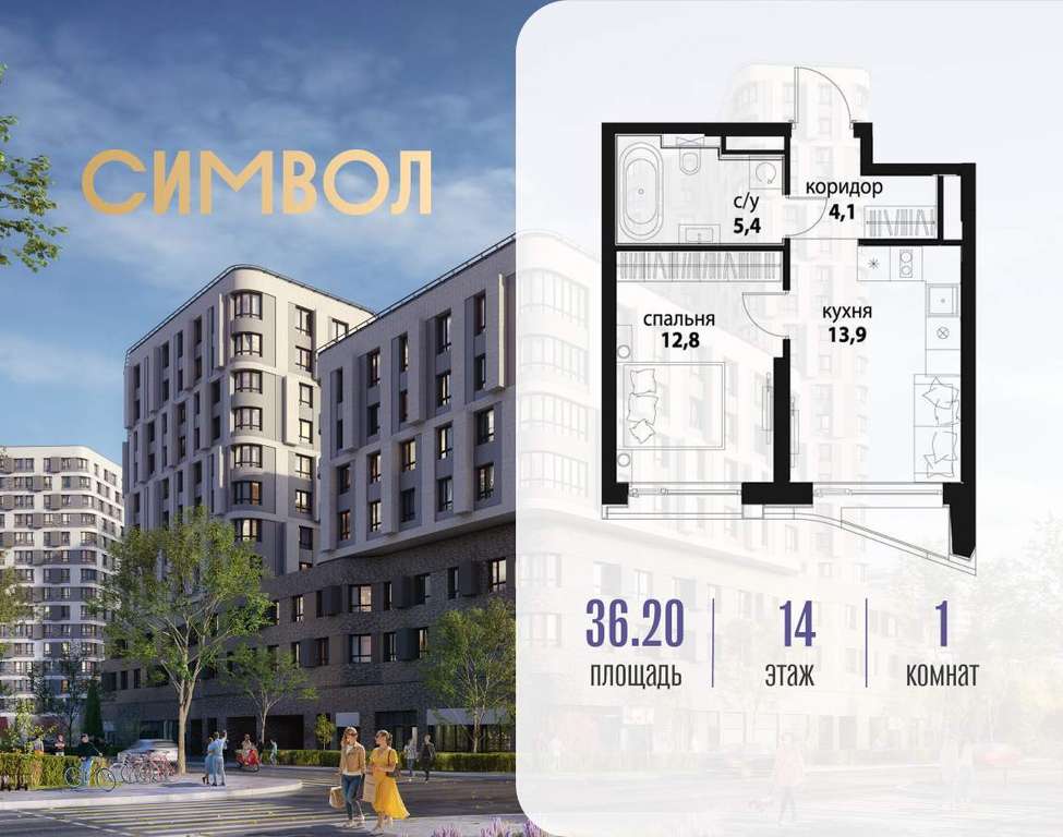 Продается 1-комнатная квартира от застройщика: общая площадь 36.20 м, жилая 12.80 м, кухня 13.90 м, 14-й этаж, жилой квартал «Вдохновение», корпус 33 (секция 1) . Срок сдачи: 4 квартал 2027 года.