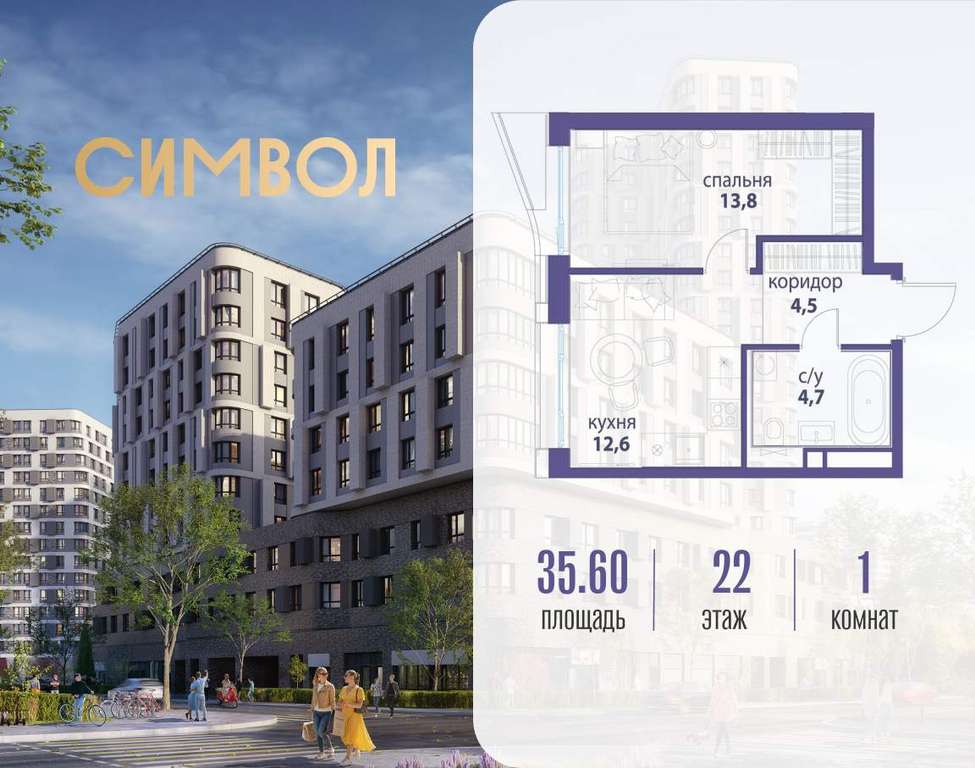 Продается 1-комнатная квартира от застройщика: общая площадь 35.60 м, жилая 13.80 м, кухня 12.60 м, 22-й этаж, жилой квартал «Вдохновение», корпус 33 (секция 3) . Срок сдачи: 4 квартал 2027 года.
