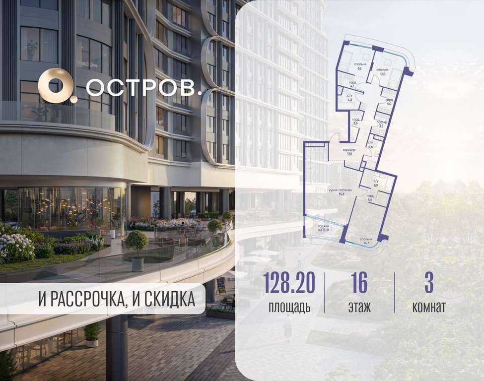 Продаётся 3-комн. квартира от застройщика: общая площадь 128.20 м, жилая 36.20 м, кухня 35.80 м, 16-й этаж, жилой квартал «Остров 7», корпус 2 (секция 2) . Срок сдачи: 1 квартал 2028 года.