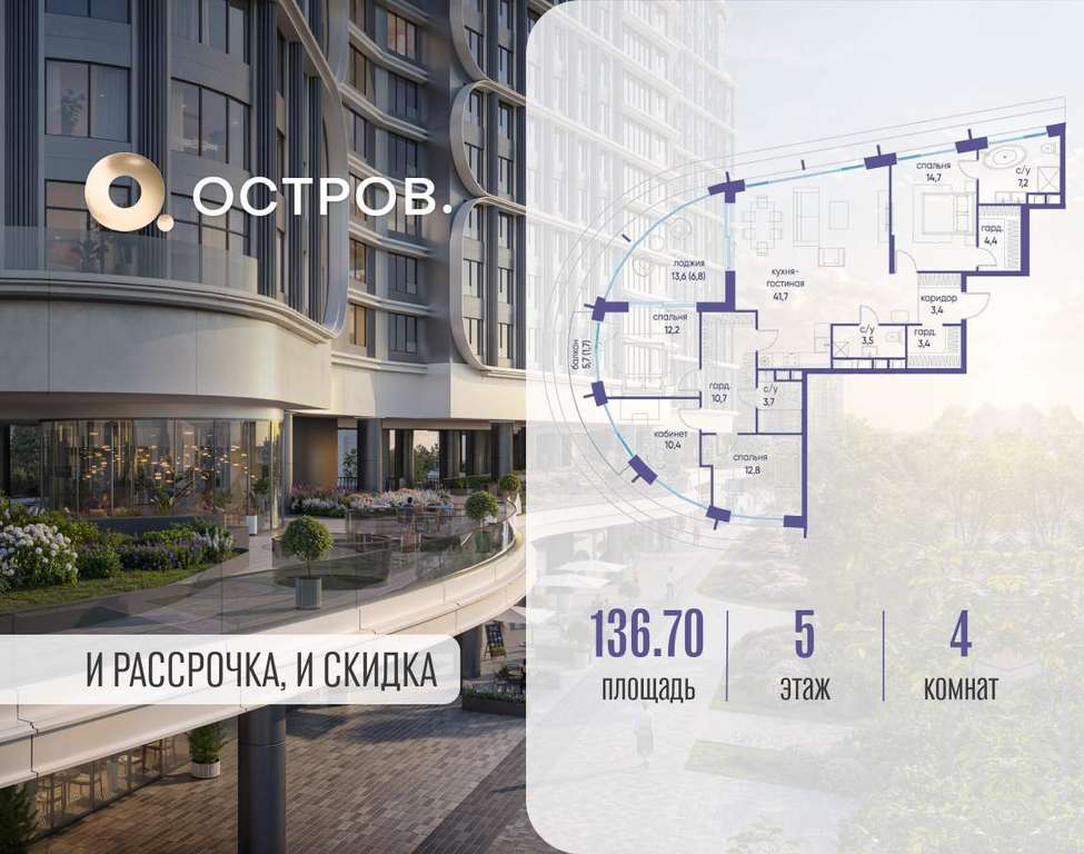 Продаётся 4-комн. квартира от застройщика: общая площадь 136.70 м, жилая 37.36 м, кухня 41.70 м, 5-й этаж, жилой квартал «Остров 7», корпус 3 (секция 2) . Срок сдачи: 1 квартал 2028 года.