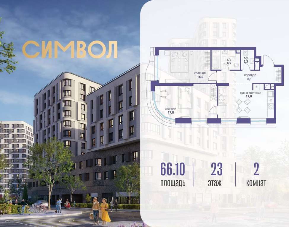 Продается 2-комнатная квартира от застройщика: общая площадь 66.10 м, жилая 33.80 м, кухня 17.00 м, 23-й этаж, жилой квартал «Вдохновение», корпус 35 (секция 1) . Срок сдачи: 4 квартал 2027 года.
