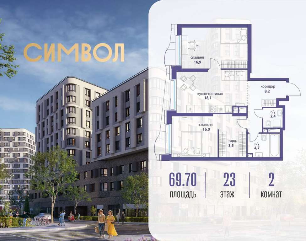 Продается 2-комнатная квартира от застройщика: общая площадь 69.70 м, жилая 32.90 м, кухня 18.10 м, 23-й этаж, жилой квартал «Вдохновение», корпус 35 (секция 1) . Срок сдачи: 4 квартал 2027 года.