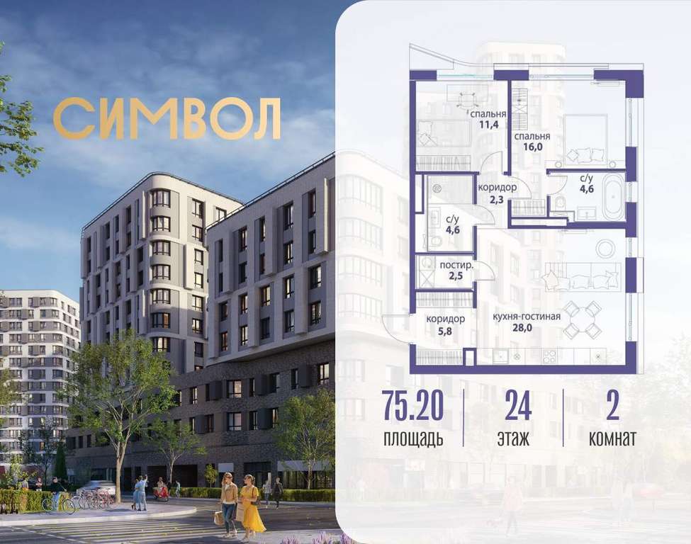 Продается 2-комнатная квартира от застройщика: общая площадь 75.20 м, жилая 27.40 м, кухня 28.00 м, 24-й этаж, жилой квартал «Вдохновение», корпус 33 (секция 3) . Срок сдачи: 4 квартал 2027 года.