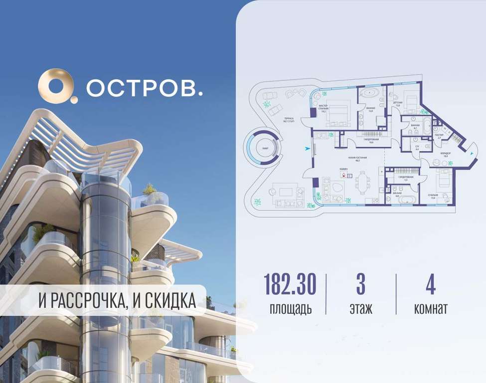 Продаётся 4-комн. квартира от застройщика: общая площадь 182.30 м, жилая 44.60 м, кухня 46.50 м, 3-й этаж, жилой квартал «Остров 10», (секция 1) . Срок сдачи: 2 квартал 2026 года.
