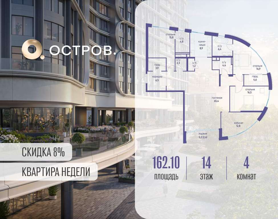 Продаётся 4-комн. квартира от застройщика: общая площадь 162.10 м, жилая 60.00 м, кухня 74.30 м, 14-й этаж, жилой квартал «Остров 7», корпус 4 (секция 1) . Срок сдачи: 1 квартал 2028 года.