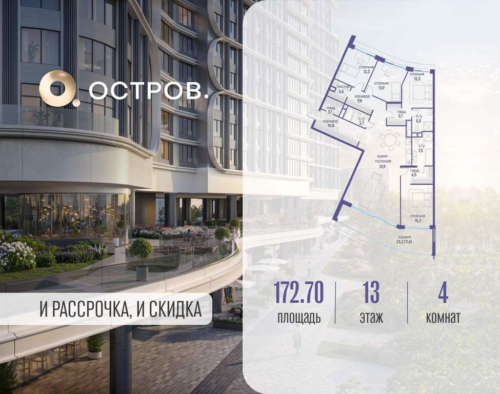 Продаётся 4-комн. квартира от застройщика: общая площадь 172.70 м, жилая 53.80 м, кухня 51.90 м, 13-й этаж, жилой квартал «Остров 7», корпус 5 (секция 2) . Срок сдачи: 3 квартал 2028 года.