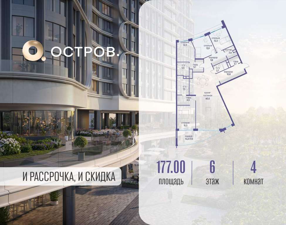 Продаётся 4-комн. квартира от застройщика: общая площадь 177.00 м, жилая 53.80 м, кухня 60.50 м, 6-й этаж, жилой квартал «Остров 7», корпус 5 (секция 1) . Срок сдачи: 3 квартал 2028 года.