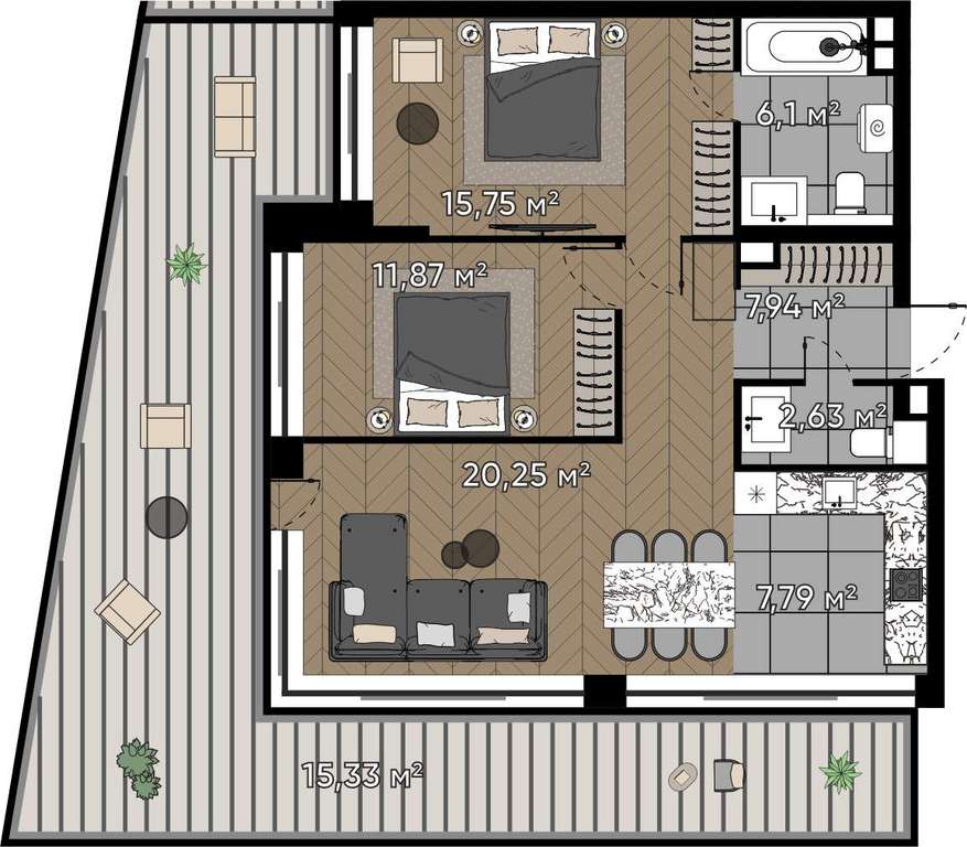Квартиры с просторными террасами - выход на свежий воздух прямо из дома, гармония природы и городской роскоши.