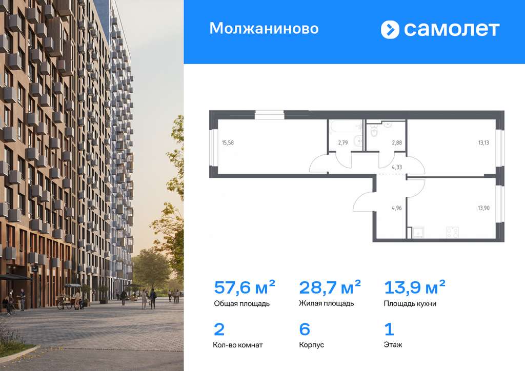 Строим кварталы для жизни с заботой о будущем. Предлагается 2-комнатная квартира комфорт-класса 57,57 кв. м в корпусе 6 на 1 этаже, в ЖК «Молжаниново»