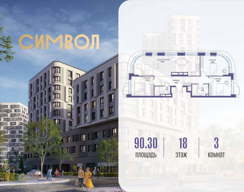 Продается 3-комнатная квартира от застройщика: общая площадь 90.30 м, жилая 37.80 м, кухня 31.60 м, 18-й этаж, жилой квартал «Вдохновение», корпус 34 (секция 1) . Срок сдачи: 4 квартал 2027 года.