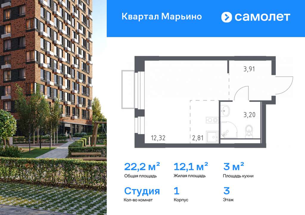 Строим кварталы для жизни с заботой о будущем. Предлагается квартира студия комфорт-класса 22,24 кв. м в корпусе 1 на 3 этаже, в ЖК «Квартал Марьино»