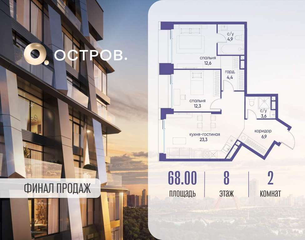 Продаётся 2-комн. квартира от застройщика: общая площадь 68.00 м, жилая 24.90 м, кухня 23.30 м, 8-й этаж, жилой квартал «Остров 12», корпус 1 (секция 1) . Срок сдачи: 1 квартал 2029 года.