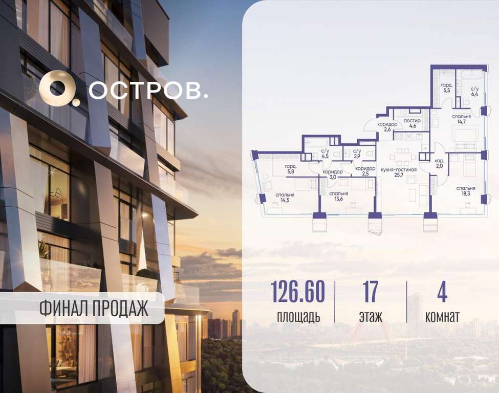 Продаётся 4-комн. квартира от застройщика: общая площадь 126.60 м, жилая 61.10 м, кухня 25.70 м, 17-й этаж, жилой квартал «Остров 12», корпус 3 (секция 1) . Срок сдачи: 1 квартал 2029 года.
