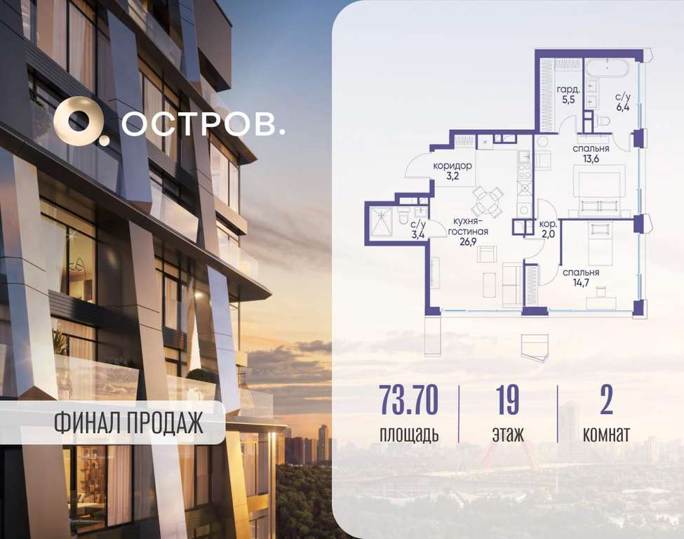 Продаётся 2-комн. квартира от застройщика: общая площадь 73.70 м, жилая 28.30 м, кухня 26.90 м, 19-й этаж, жилой квартал «Остров 12», корпус 3 (секция 1) . Срок сдачи: 1 квартал 2029 года.