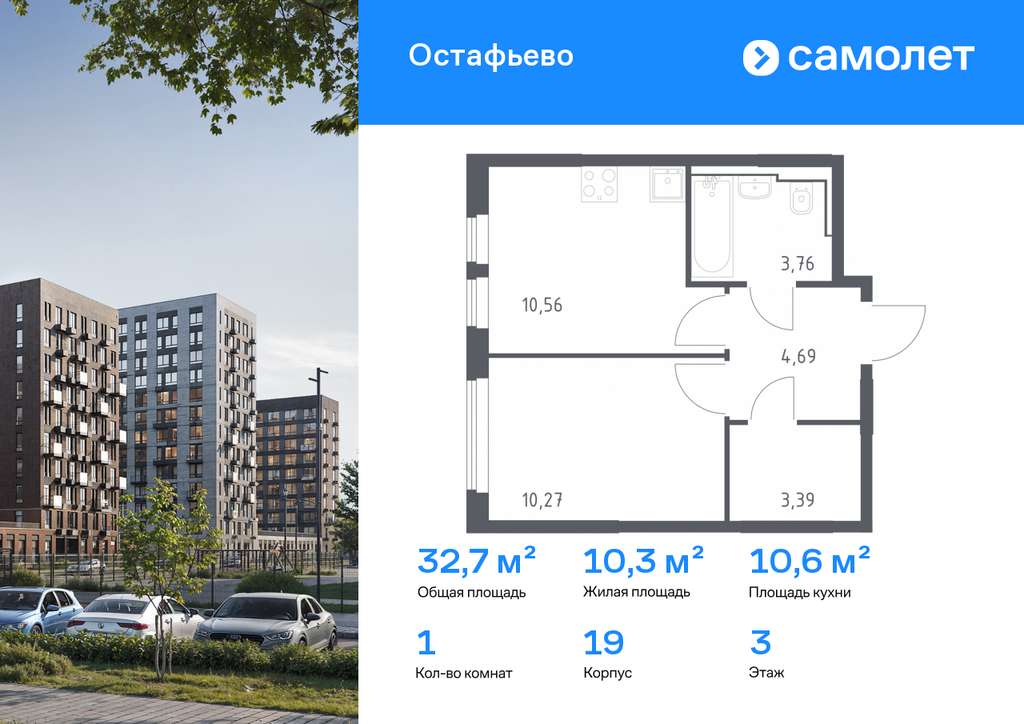 Строим кварталы для жизни с заботой о будущем. Предлагается 1-комнатная квартира комфорт-класса 32,67 кв. м в корпусе 19 на 3 этаже, в ЖК «Остафьево»