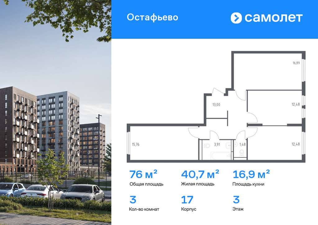 Строим кварталы для жизни с заботой о будущем. Предлагается 3-комнатная квартира комфорт-класса 76 кв. м в корпусе 17 на 3 этаже, в ЖК «Остафьево»