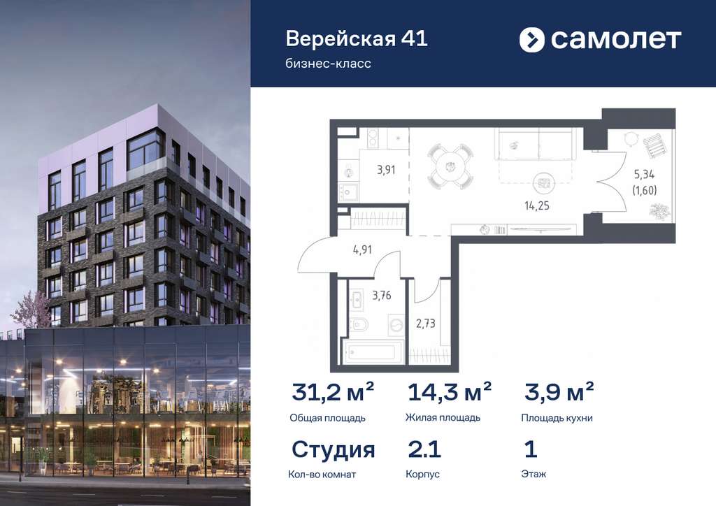 Строим кварталы для жизни с заботой о будущем. Предлагается квартира студия бизнес-класса 31,16 кв. м в корпусе 2.1 на 1 этаже, в «Верейская 41»