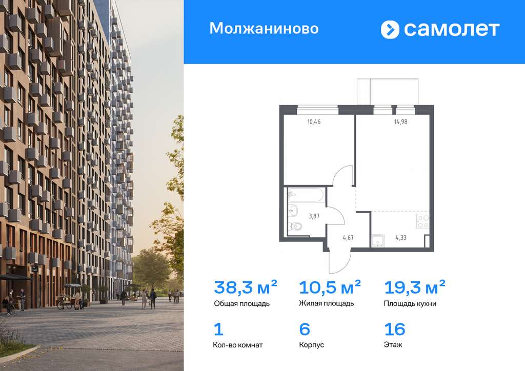 Строим кварталы для жизни с заботой о будущем. Предлагается 1-комнатная квартира комфорт-класса 38,31 кв. м в корпусе 6 на 16 этаже, в ЖК «Молжаниново»